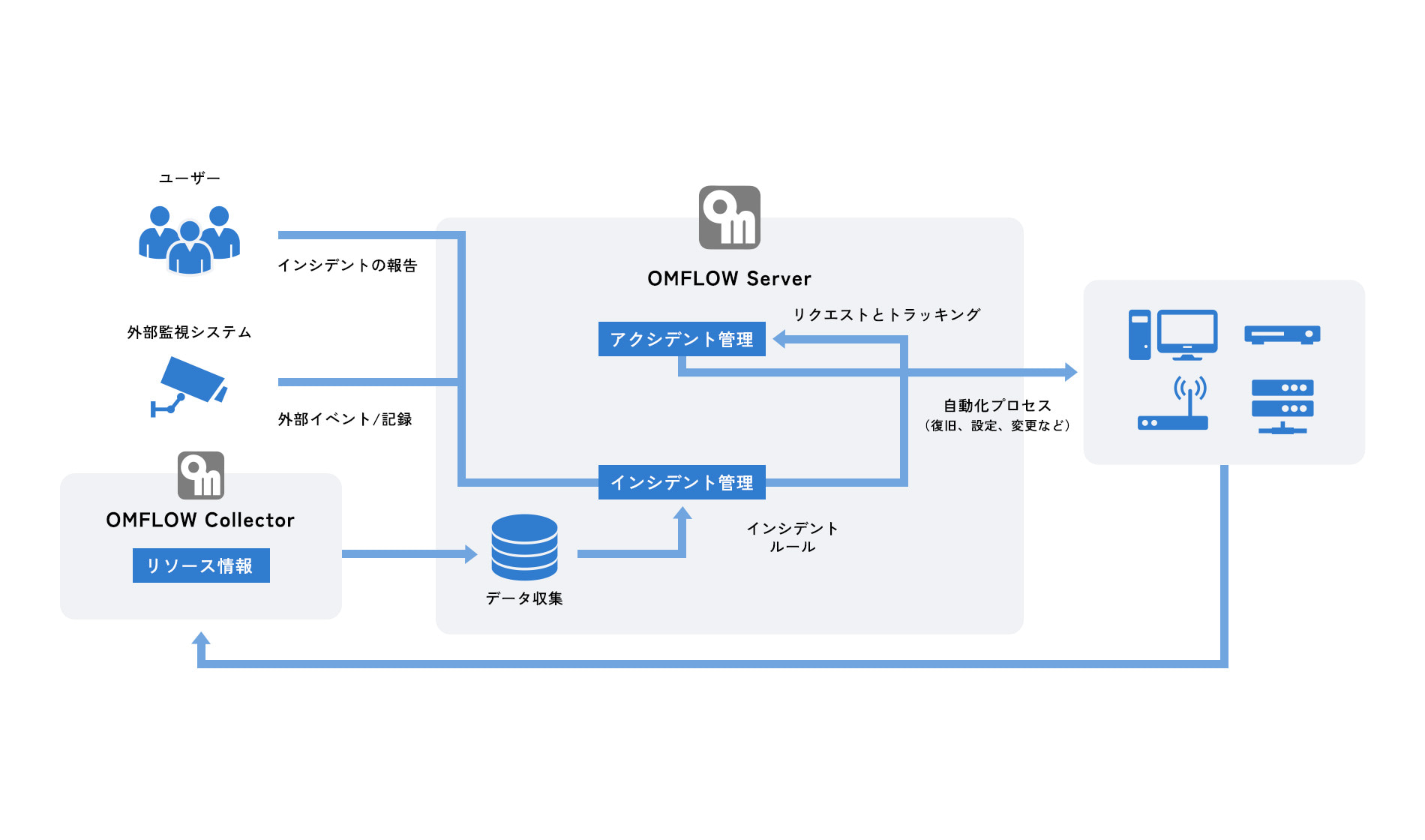 OMFLOWを導入することで、チケット発行、担当者アサイン、復旧処理、完了報告までを自動化。