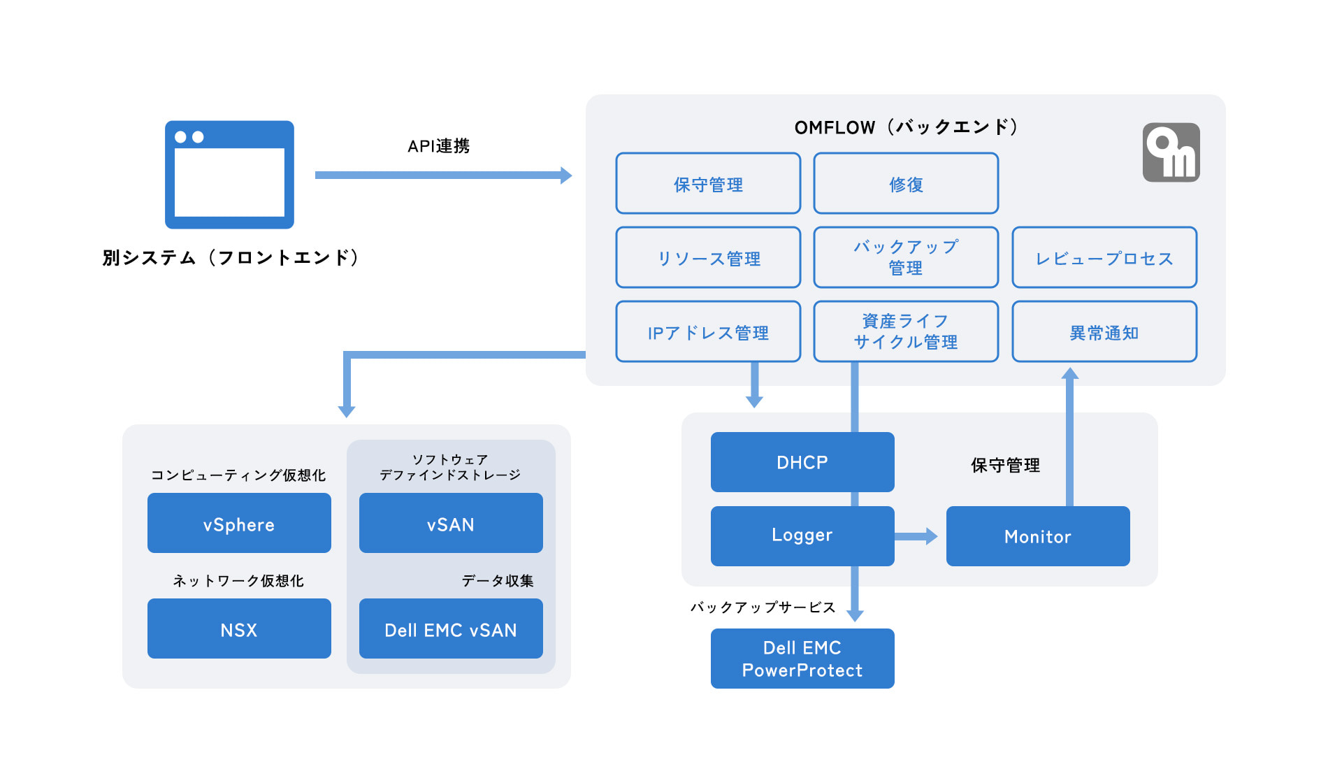たとえば、デバイス監視システムから上がったアラートをトリガーに、仮想環境やストレージサーバーに対する修復・復旧処理をOMFLOWが自動で実行可能です。