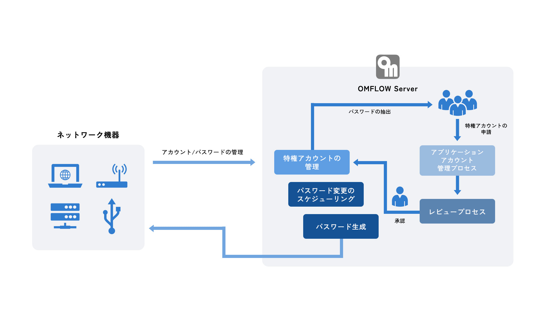 OMFLOWなら、あらかじめ設定したスケジュールでパスワード変更申請を自動で発行し、承認後に変更処理を自動実行。