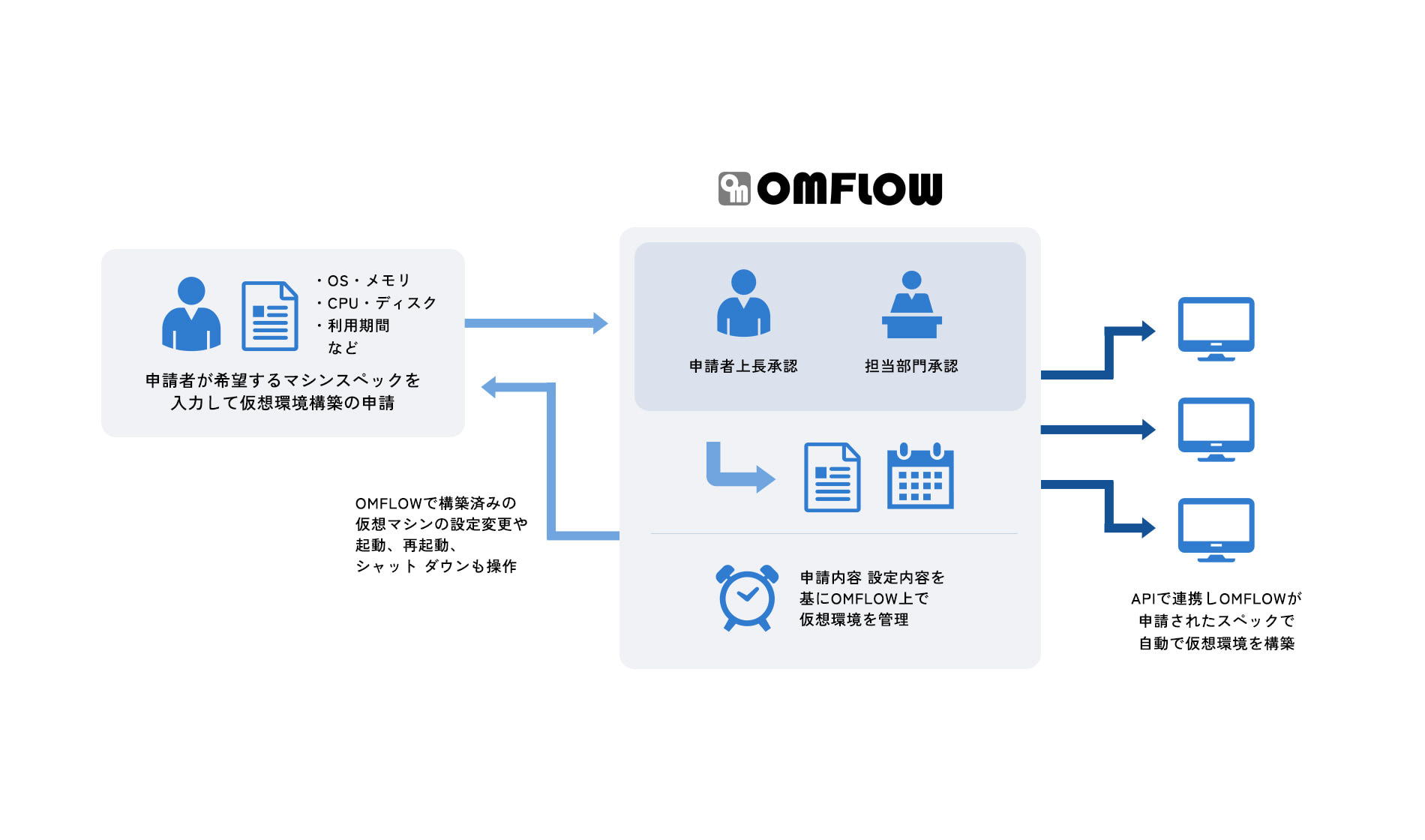 OMFLOWを導入すれば、あらかじめ定型化されたVMのテンプレートをもとに、申請から承認、環境構築までを自動化。申請手続きが簡単になり、リソース管理者の作業負担も分散されます。